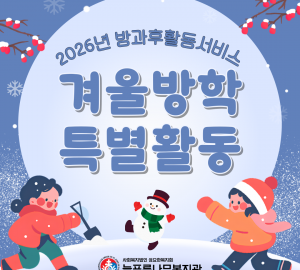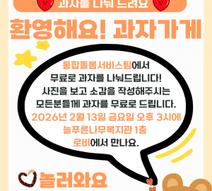 활동게시판 카테고리 전체활동나눔 게시판 검색 490 활동 [기획홍보팀] 2026년 2월 환대인 안내 2026-02-26 196 489 공지 [운영지원팀] 3월 식단표 2026-02-23 177 488 활동 [통합돌봄서비스팀] 놀러와요 과자가게로 2026-02-09 260 487 활동 [평생교육지원팀] 2026년 방과후활동서비스 겨울방학 특별활동 2026-01-26 372 486 활동 [기획홍보팀] 찾아가는 푸드트럭 밥먹차 활동 안내 2025-12-29 590 485 공지 [운영지원팀] 1월 식단표 2025-12-22 701 484 활동 [평생교육지원팀]2025년 이용인 간담회 결과 및 반영사항 안 2025-12-17 639 483 활동 2025년 고립, 고독, 고령 발달장애인 지원 사업을 마치며 2025-12-16 626 482 활동 [성장지원팀] 지적장애인 양육코칭 엄마들의 재능나눔활동 2025-12-12 640 481 활동 2025년 만남의 날 - '감사의 정원' 2025-12-09 621 480 활동 [평생교육지원팀]제과제빵 첫 걸음 2025-12-09 639 479 활동 [지역이음팀]2025년 우리 모두(Do!) 주민 모임 하반기 활동 내용 2025-12-09 534 478 나눔 [후원] 2025년 The-K 저축은행 후원금 전달식 2025-12-09 407 477 나눔 [후원] 2025년 10월~12월 푸른나래 나눔소식 2025-12-09 444 476 활동 [지역이음팀] 2025년 별빛 홍보단 하반기 활동 내용 2025-12-09 530 475 활동 [지역이음팀] 2025년 김장김치 나눔행사 2025-12-09 481 474 활동 2025년 평생교육지원팀 '우리들의 1년 이야기' 활동 공유합니다 2025-12-09 616 473 활동 [지역이음팀] 좋은친구모임 11월 활동 소개 2025-12-09 533 472 활동 [지역이음팀] 좋은친구모임 10월 활동 소개 2025-12-09 475 471 활동 [일자리지원팀] 취업자 간담회 2025-12-09 557 열린1페이지 2페이지 3페이지 4페이지 5페이지 6페이지 7페이지 8페이지 9페이지 10페이지 다음 맨끝 검색 검색대상 제목내용제목+내용글쓴이글쓴이(코) 검색어 필수 검색 닫기