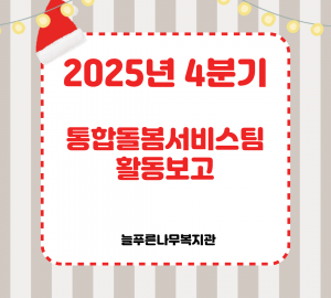 활동게시판 카테고리 전체열린 분류 활동나눔 게시판 검색 385 활동 [지역이음팀] 장애공감교육&캠페인 (하반기) N새글 2025-12-08 22 384 활동 2025년 평생교육지원팀 '우리들의 1년이야기' 활동보고 N새글 2025-12-08 21 383 활동 [평생교육지원팀] 2025년 방과후활동서비스 외부활동 - 강서청소년회관 스마트짐(재미짐) N새글 2025-12-08 17 382 활동 [평생교육지원팀] 2025년 반려동물 프로그램 활동보고 2025-12-04 84 381 활동 [평생교육지원팀] 2025년 댄스 프로그램 활동보고 2025-12-04 77 380 활동 [평생교육지원팀] 2025년 노래, 난타 프로그램 활동보고 2025-12-04 73 379 활동 [평생교육지원팀] 2025년 숲체험 프로그램 활동보고 2025-12-04 60 378 활동 [평생교육지원팀] 2025년 이머시브 뮤지컬 프로그램 활동보고 2025-12-04 54 377 활동 [통합돌봄서비스팀] 통합돌봄 10월, 11월, 12월 활동 소개 2025-12-04 66 376 활동 [일자리지원팀] 현장중심 직무양성과정 활동내용 공유 2025-11-27 182 375 활동 [자원봉사] 2025년 11월 우리는 푸른인(人) 인터뷰 2025-11-18 167 374 활동 [기획홍보팀] 2025년 10월 환대인 안내 2025-10-24 518 373 활동 [지역이음팀] 가을맞이 소감나눔 이벤트 2025-10-20 416 372 활동 [지역이음팀] 옹달샘서포터즈 중간간담회&단체활동 2025-10-20 360 371 활동 [지역이음팀] 좋은친구모임 9월 활동 소개 2025-10-20 417 370 활동 [통합돌봄서비스팀] 통합돌봄 7월, 8월, 9월 활동 소개 2025-10-16 397 369 활동 [지역이음팀]2025년 우리 모두(Do!) 주민 모임 상반기 활동 내용 2025-10-14 385 368 활동 [지역이음팀] 2025년 별빛 홍보단 상반기 활동 내용 2025-10-14 376 367 활동 [기획홍보팀] 제23회 그라나다한마당 활동 안내 2025-10-14 414 366 활동 25년 일상에서 쉽게 실천할 수 있는 환경캠페인 당첨자 발표 2025-10-10 413 열린1페이지 2페이지 3페이지 4페이지 5페이지 6페이지 7페이지 8페이지 9페이지 10페이지 다음 맨끝 검색 검색대상 제목내용제목+내용글쓴이글쓴이(코) 검색어 필수 검색 닫기