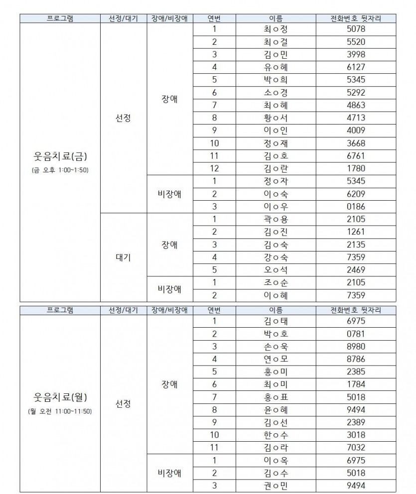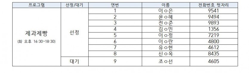 ※ 신청을 취소하는 경우 대기자에게 차례가 넘어가게 되며, 대기순서는 연번과 동일합니다.