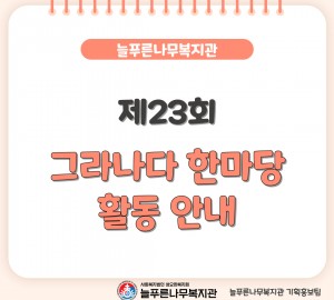 활동게시판 카테고리 전체열린 분류 활동나눔 게시판 검색 367 활동 [기획홍보팀] 제23회 그라나다한마당 활동 안내 N새글 2025-10-14 14 366 활동 25년 일상에서 쉽게 실천할 수 있는 환경캠페인 당첨자 발표 2025-10-10 90 365 활동 2025년 9월 환대인 안내 2025-09-30 190 364 활동 [평생교육지원팀]찾아오는 문화공연 : 서커스 밴드 2025-09-05 425 363 활동 [지역이음팀] 좋은친구모임 8월 활동 소개 2025-09-02 362 362 활동 [지역이음팀] 좋은친구모임 7월 활동 소개 2025-09-02 424 361 활동 [평생교육지원팀] 문화예술교육 '춤추며 에너지 UP! 줌바댄스' 2025-09-01 440 360 활동 [평생교육지원팀] 2025년 이머시브 뮤지컬 프로젝트 프로그램 활동보고 2025-09-01 419 359 활동 [평생교육지원팀] 2025년 우리가 그린(GREEN) 일상 프로그램 활동보고 2025-09-01 358 358 활동 [평생교육지원팀] 2025년 지구를 위한 환경실천교실 프로그램 활동보고 2025-09-01 650 357 활동 [평생교육지원팀] 2025년 한글교육(생활속 한글, 응용한글, 이야기속 한글) 프로그램 활동공유 2025-08-29 462 356 활동 [평생교육지원팀] 2025년 캘리그라피(기초,심화) 프로그램 활동보고 2025-08-28 510 355 활동 [평생교육지원팀] 2025년 아이클레이 프로그램 활동보고 2025-08-26 456 354 활동 [평생교육지원팀] 2025년 상반기 프로그램 작품사진 2025-08-22 492 353 활동 [평생교육지원팀] 2025년 방과후활동서비스 여름방학 특별활동 2025-08-19 529 352 활동 [평생교육지원팀] 평생교육프로그램 문화예술교육 "마음톡톡 음악교실" 2025-08-18 529 351 활동 [자원봉사] 2025년 7월 우리는 푸른인(人) 인터뷰 2025-07-31 551 350 활동 [지역이음팀] 우리모두(Do!) 주민교육 2025-07-31 659 349 활동 [기획홍보팀] 2025년 이용인 신규도서 안내 2025-07-30 558 348 활동 [기획홍보팀] 2025년 7월 환대인 안내 2025-07-23 915 열린1페이지 2페이지 3페이지 4페이지 5페이지 6페이지 7페이지 8페이지 9페이지 10페이지 다음 맨끝 검색 검색대상 제목내용제목+내용글쓴이글쓴이(코) 검색어 필수 검색 닫기