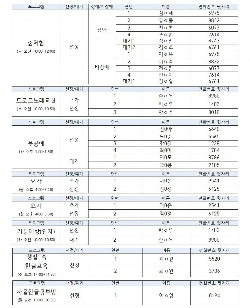 ※ 신청을 취소하는 경우 대기자에게 차례가 넘어가게 되며, 대기순서는 연번과 동일합니다.